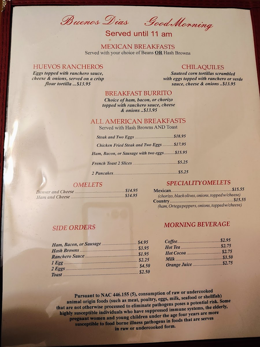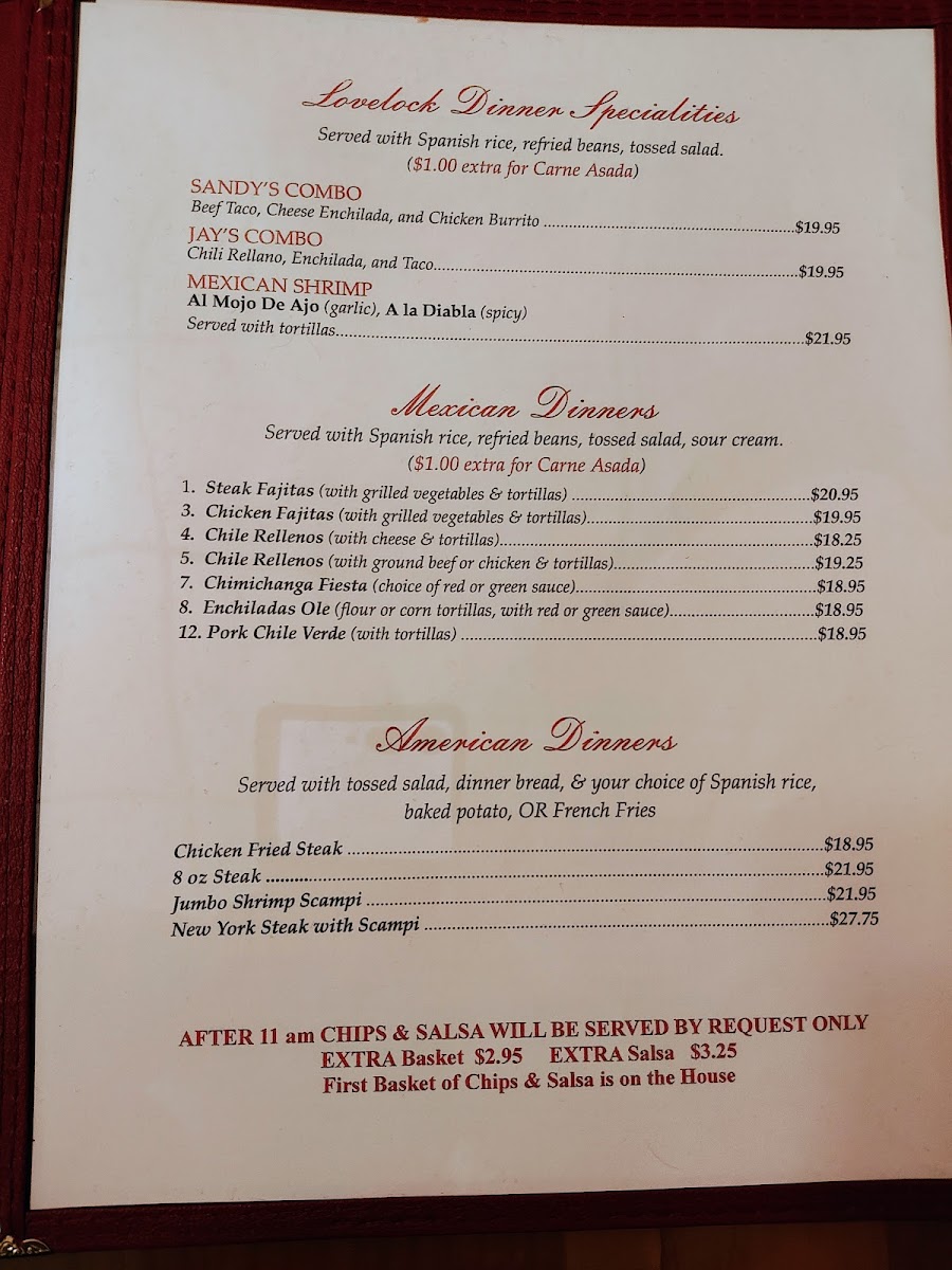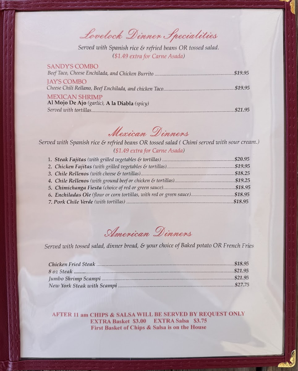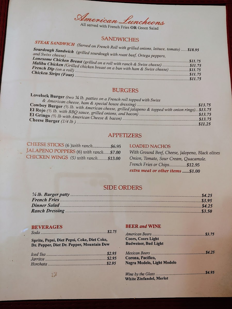 Lovelock Cafe offers a diverse menu that caters to both Mexican and American tastes, making it a great spot for a variety of dining experiences. For those craving Mexican flavors, the Mexican Luncheons feature options such as Tacos and Burritos starting from $4.99, along with heartier dishes like the Macho Burrito and Chimichanga Grande. For breakfast, their Chilaquiles and Huevos Rancheros are popular choices. If you're in the mood for something a little different, the Mexican Dinners include options like Chicken Fajitas and Pork Chile Verde priced at $12.99 and $11.99, respectively.